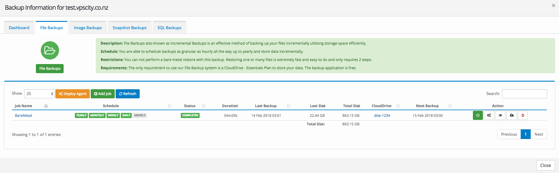 The VpsCity Backup System offers easy to use File Level Backups, Image Level Backups and Snapshot Backups for your server. You can schedule backups as granular as hourly all the way up to yearly and store data incrementally. Our backup system provide single click server restore process and alert notifications for success or failed backups.