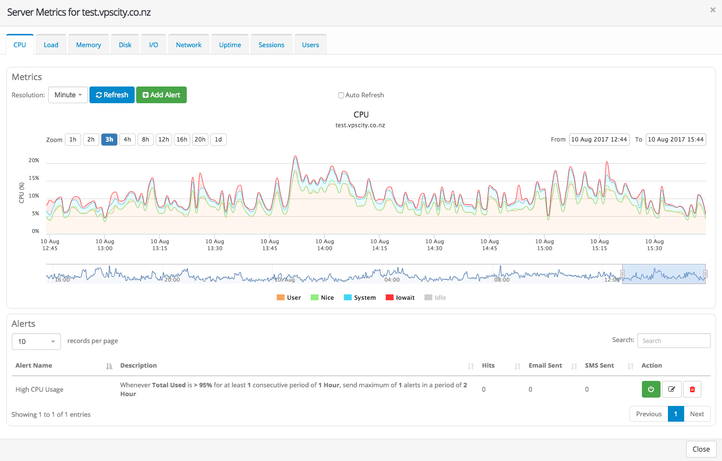 VpsCity now enables you to monitor and track important server resource usage information (CPU, Memory, Network, Disk, Load, I/O, Uptime, Sessions and Users) and you are also able to set notifications and actions based on metrics via our Server Metrics tool.