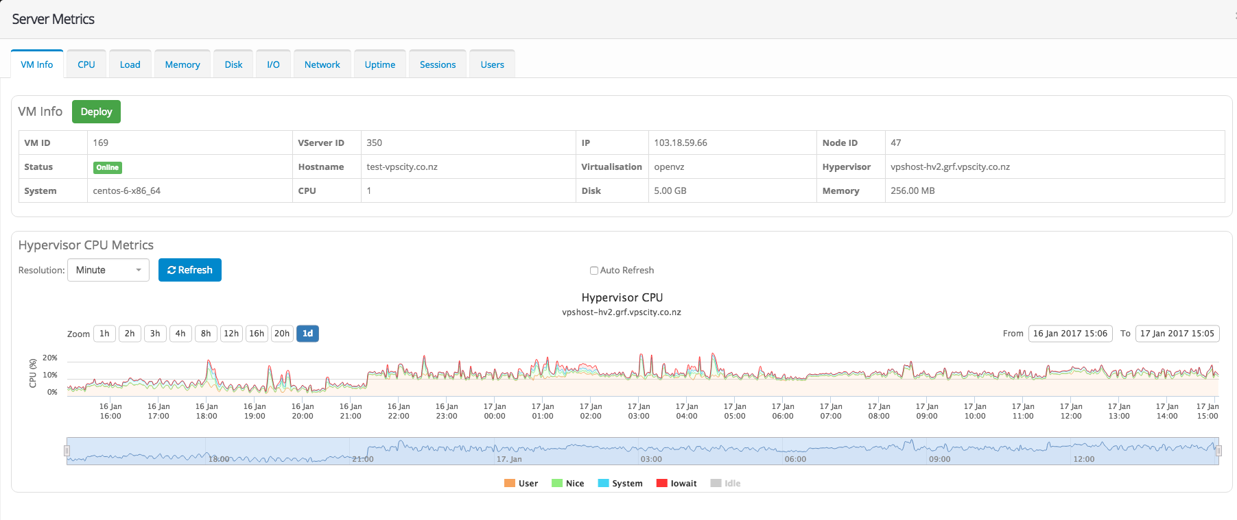 We also provide server metrics graph information for your servers include cpu, memory, disk, I/O network and more.